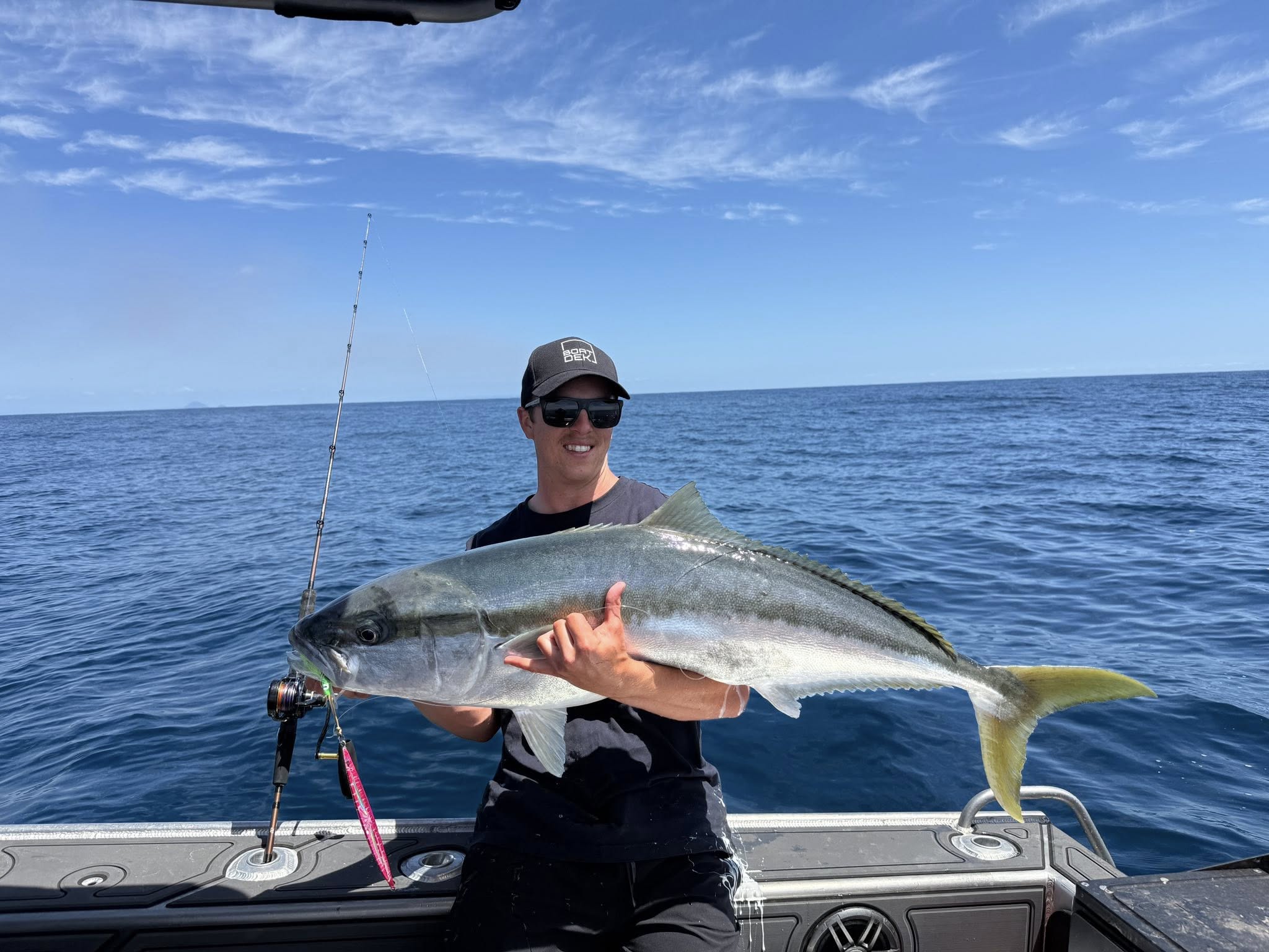 During the morning there was one other boat fishing the same pin, and we noticed the boat full of super keen young men who didn't seem to be in on the action like we were. We decided to give them a Glow Green Gold Rattle jig, and told them it will change everything, and it did. We got an email a week later from their dad thanking us and told us his kids were fizzing when they got home. This is what his son Samuel had to say about their day.